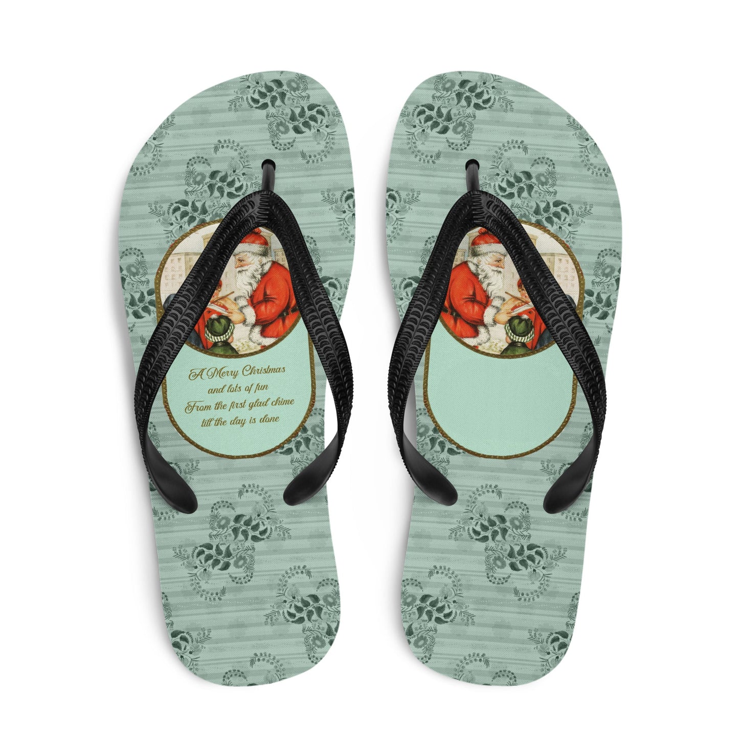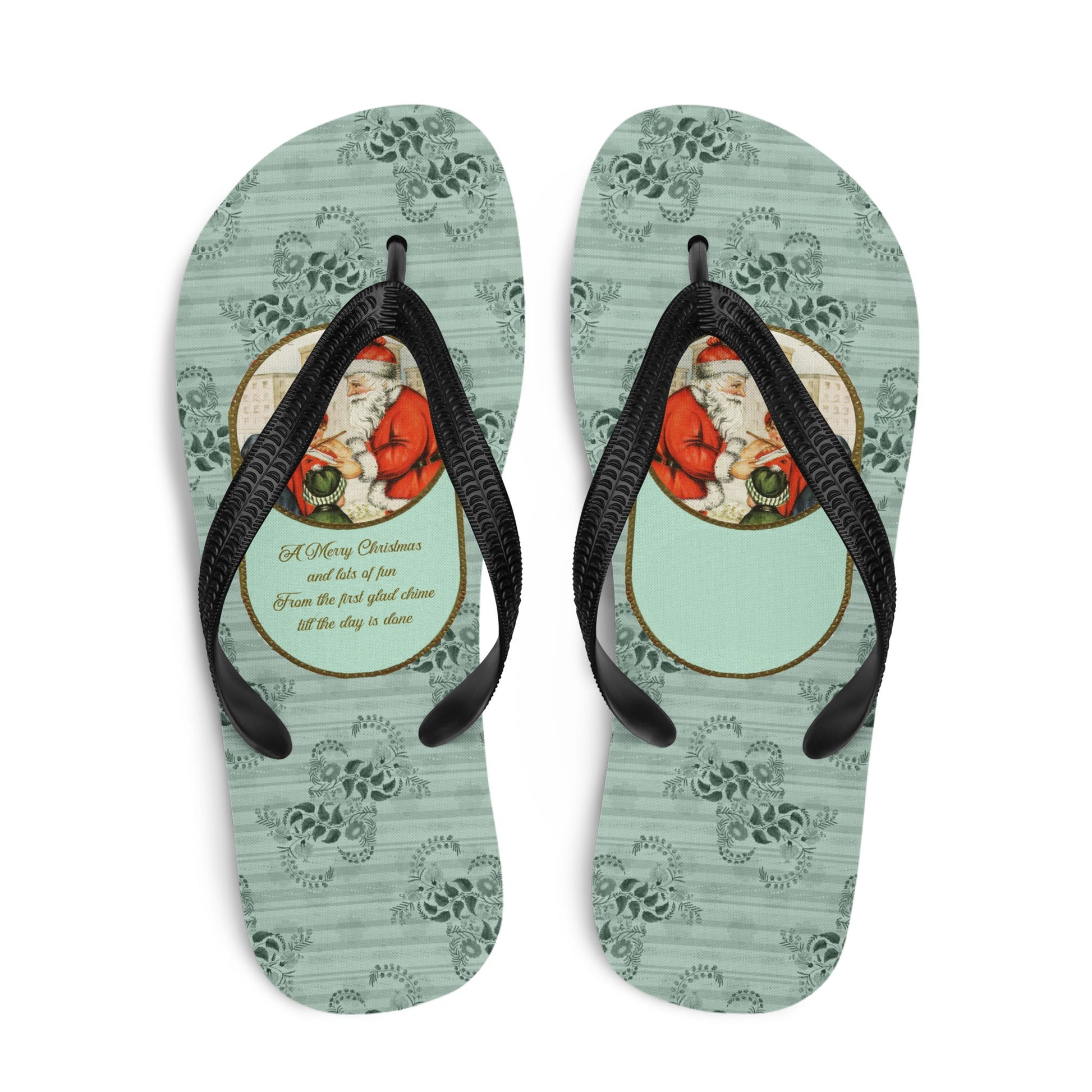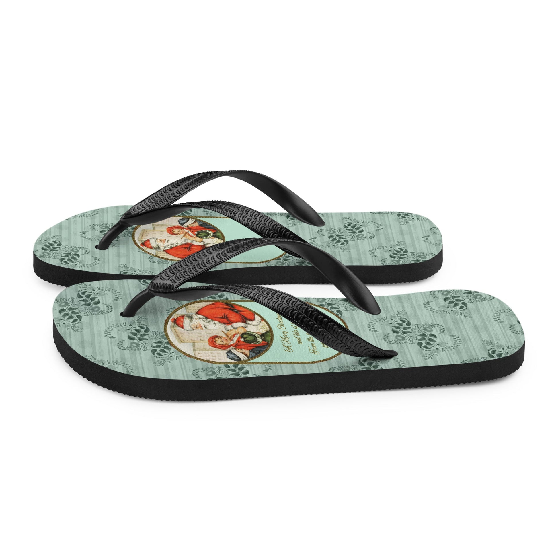 This flip-flop pair features a cotton lining printed with a vintage Santa Claus design. They feature a small slot to write your own personal message or a special date, or we can write it for you upon request.