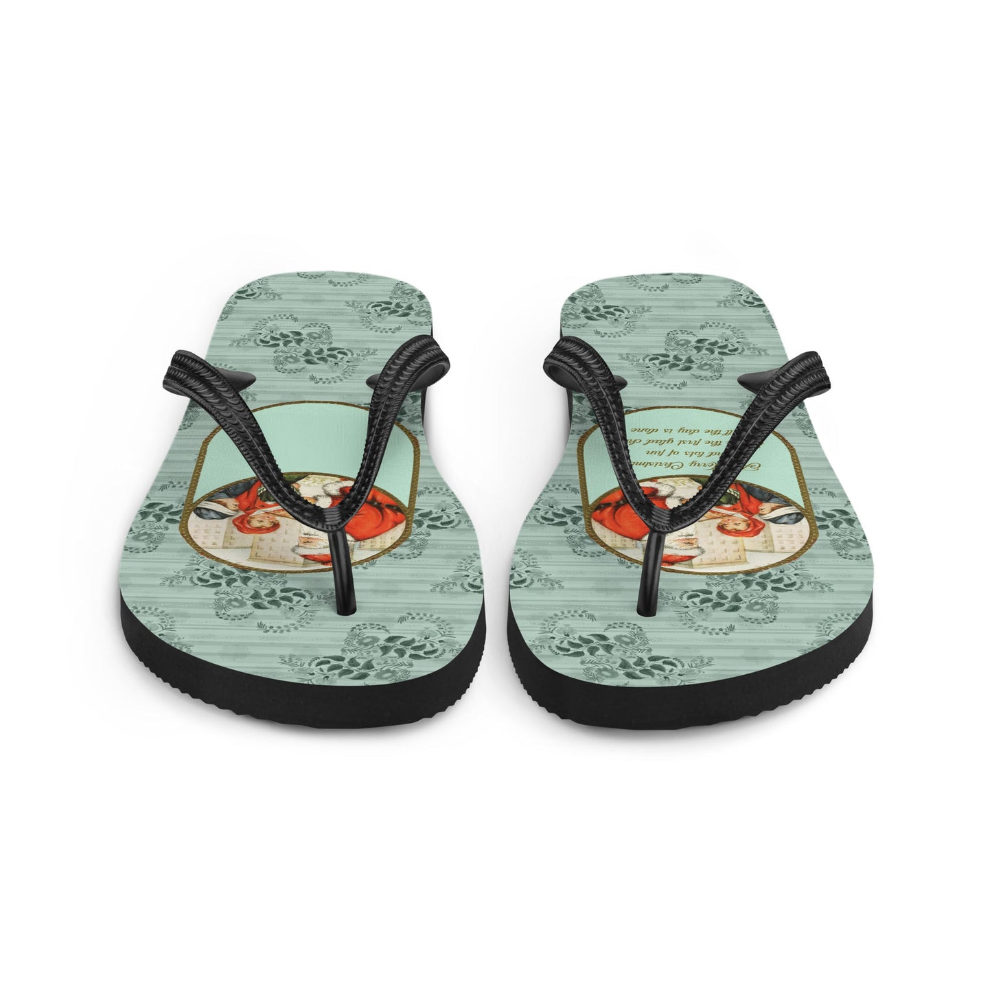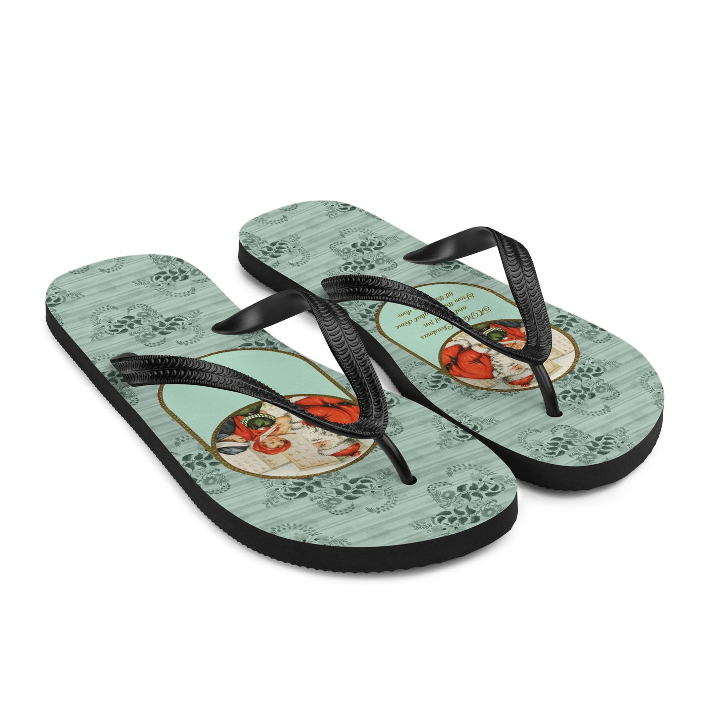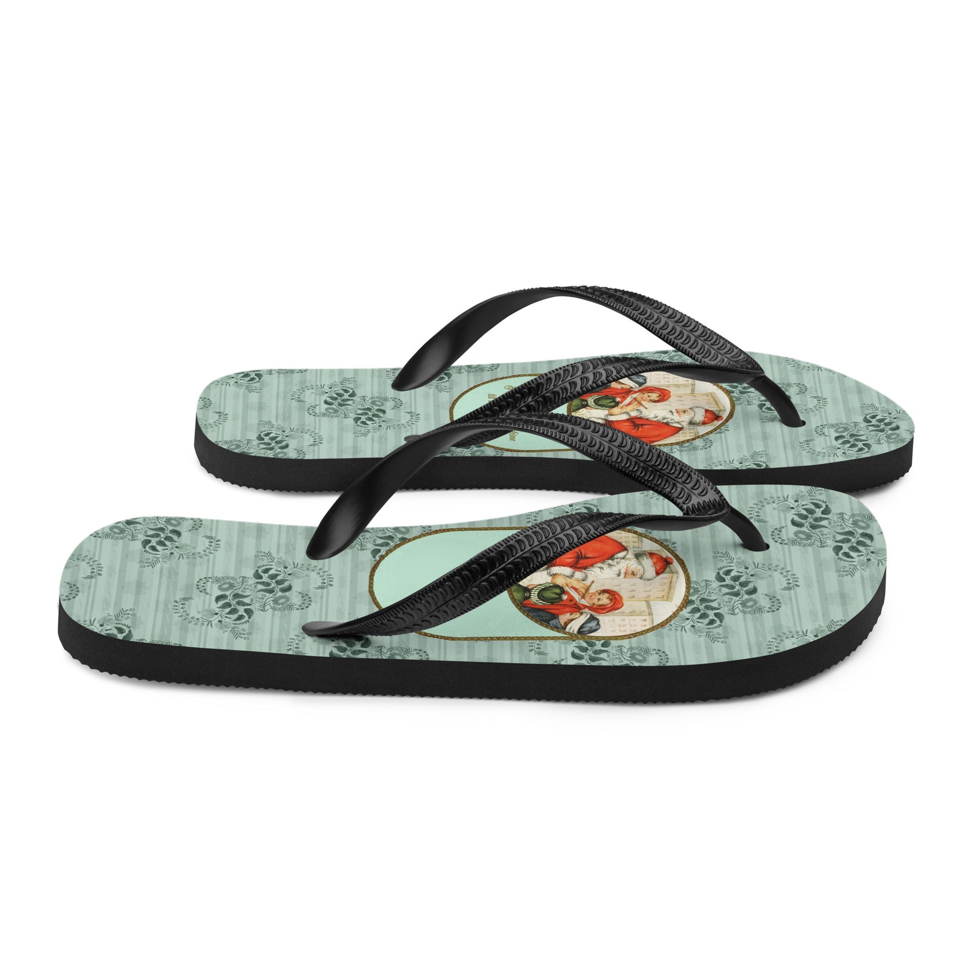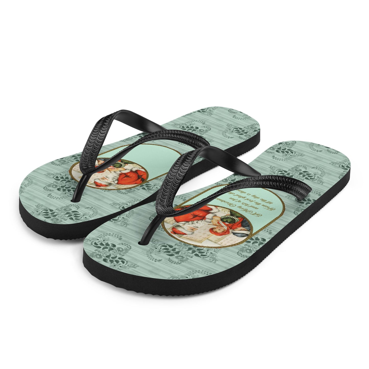 This flip-flop pair features a cotton lining printed with a vintage Santa Claus design. They feature a small slot to write your own personal message or a special date, or we can write it for you upon request.