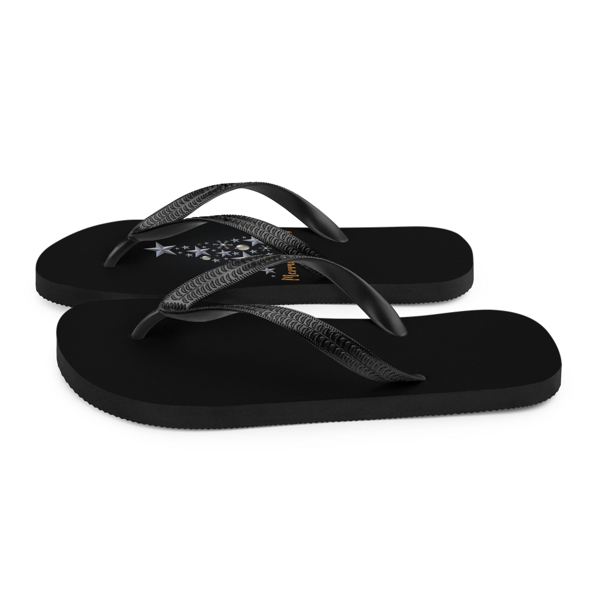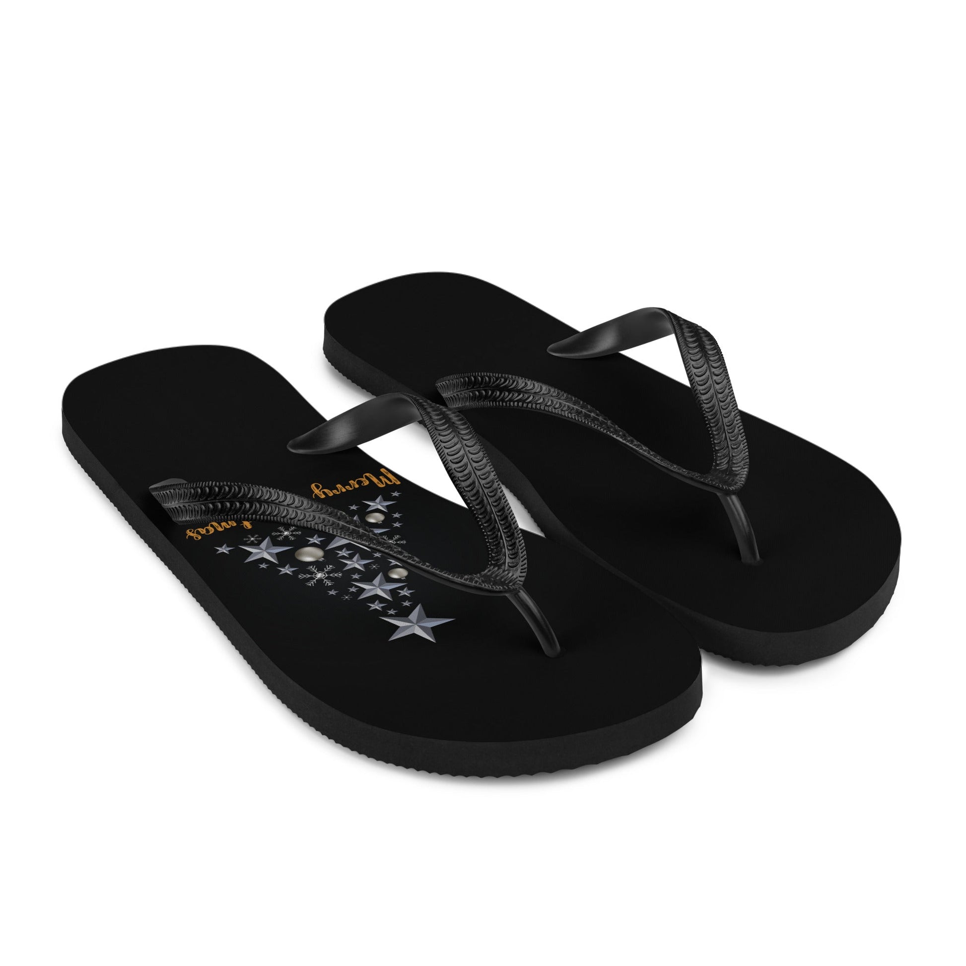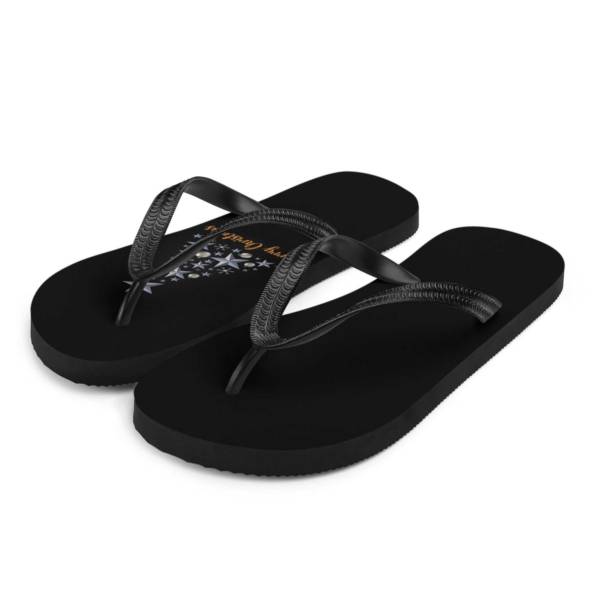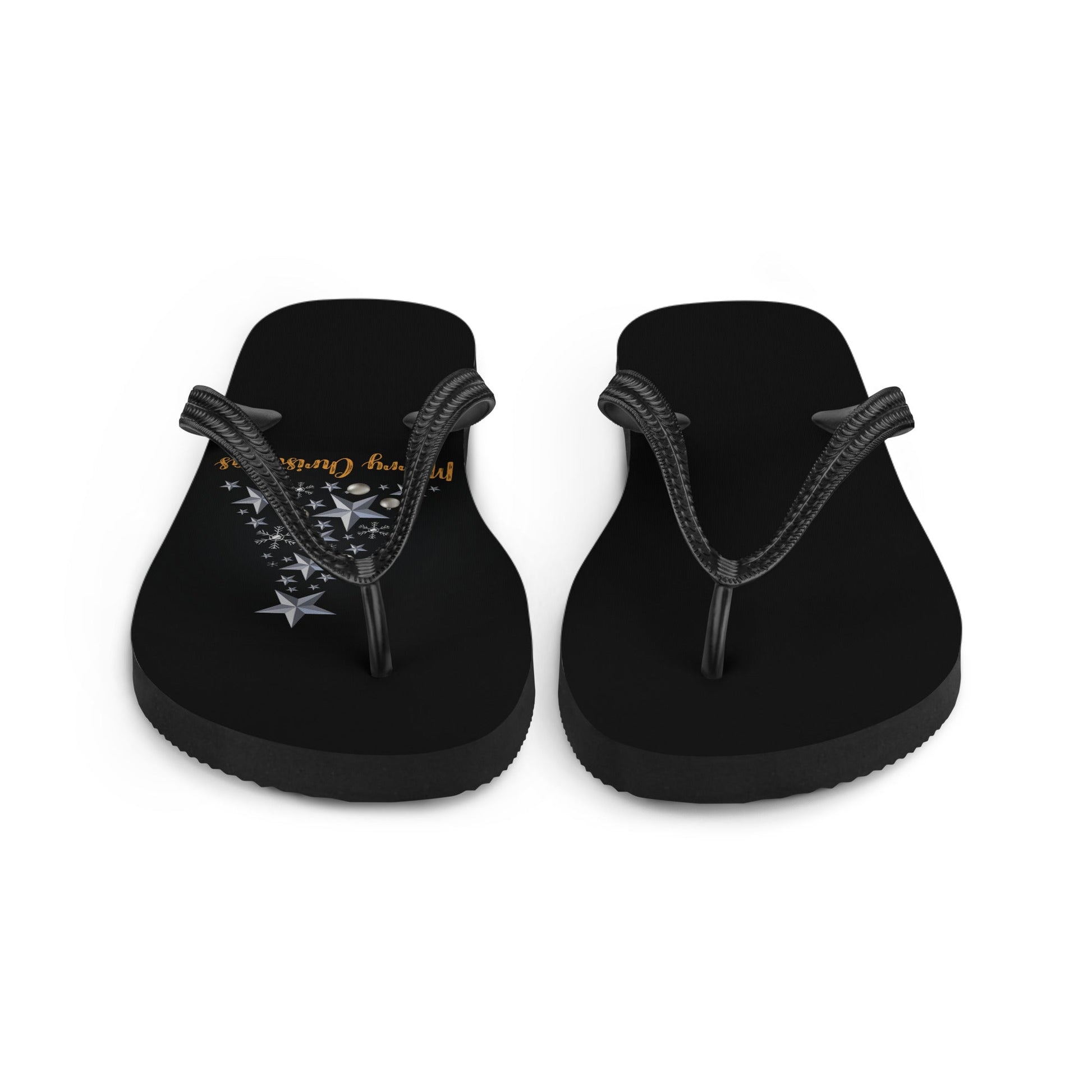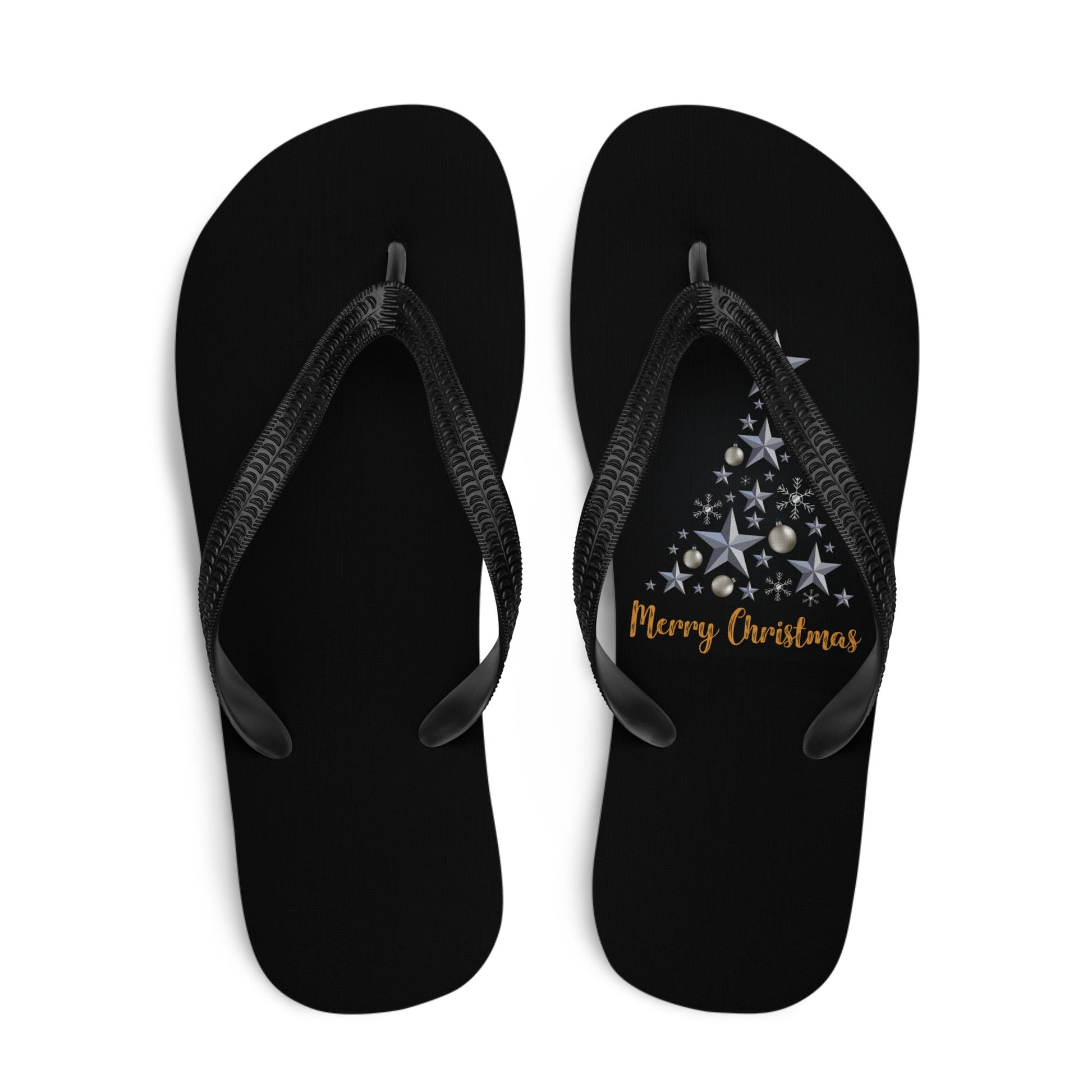 Black Tie Christmas Flip Flops are perfect for your holiday party or any time you want to show off your festive spirit! These flip-flops feature a silver Xmas Tree print and a Merry Christmas wishing message.