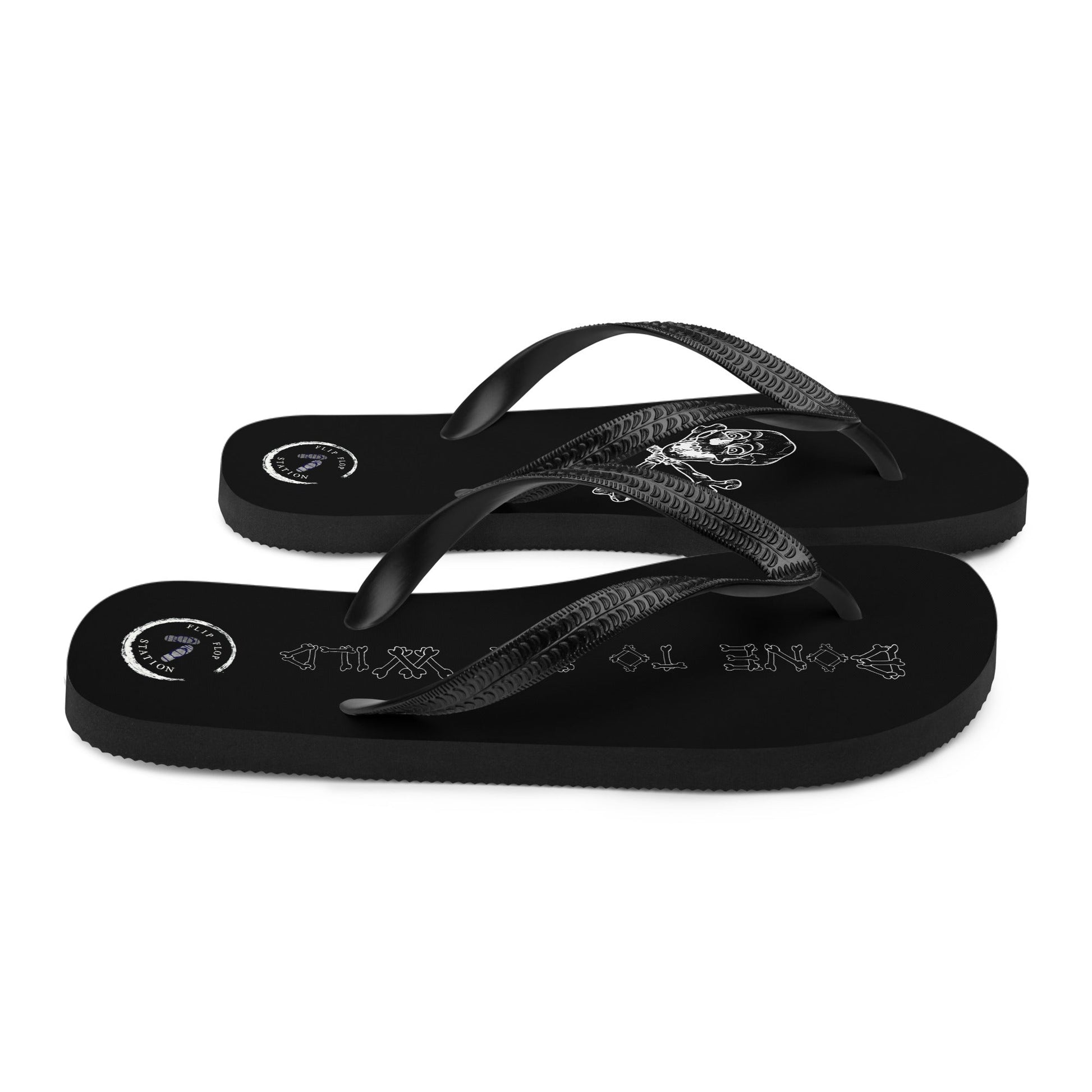 Unleash Your Inner Rebel: Step into fearless style with our Skull-Emblazoned Flip Flops. Featuring a bold skull and the legend 'Bone to Be Wild,' these flip flops exude edgy charm. Embrace your adventurous spirit and make a statement that roars. Get yours now!