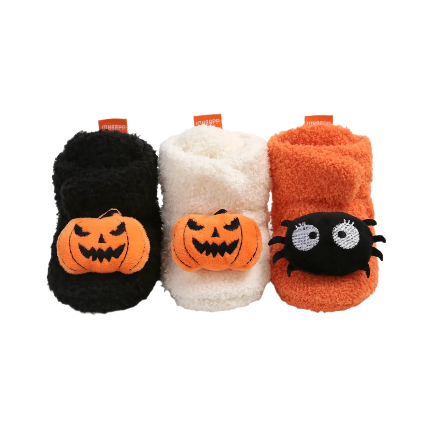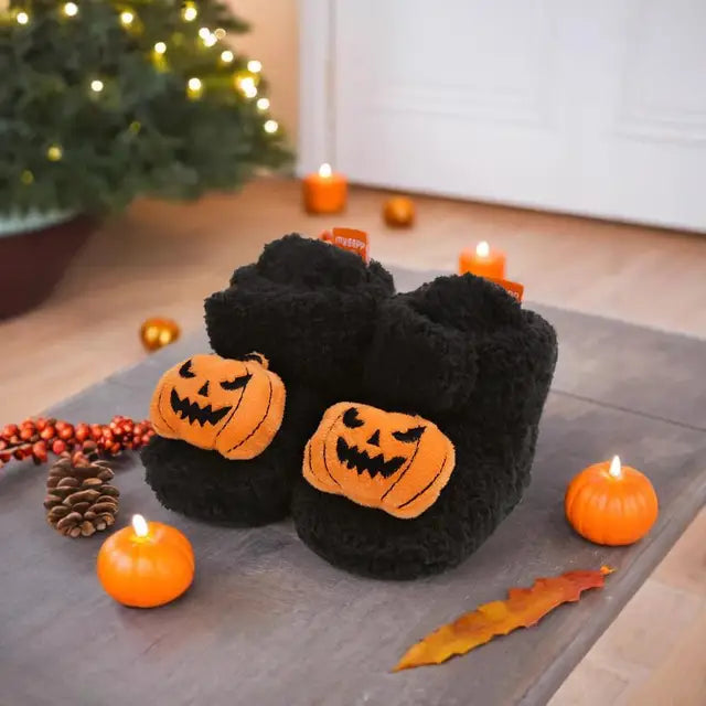 These adorable Halloween Pumpkin Baby Booties Slippers are perfect for keeping little feet warm and festive! Designed in vibrant orange, classic black, and crisp white, these booties feature charming  designs that are sure to delight. Made from soft, cozy materials, they provide comfort and style for your little one during the spooky season. Whether for trick-or-treating, a Halloween party, or just lounging at home, these booties are a must-have accessory for your baby's Halloween wardrobe!
