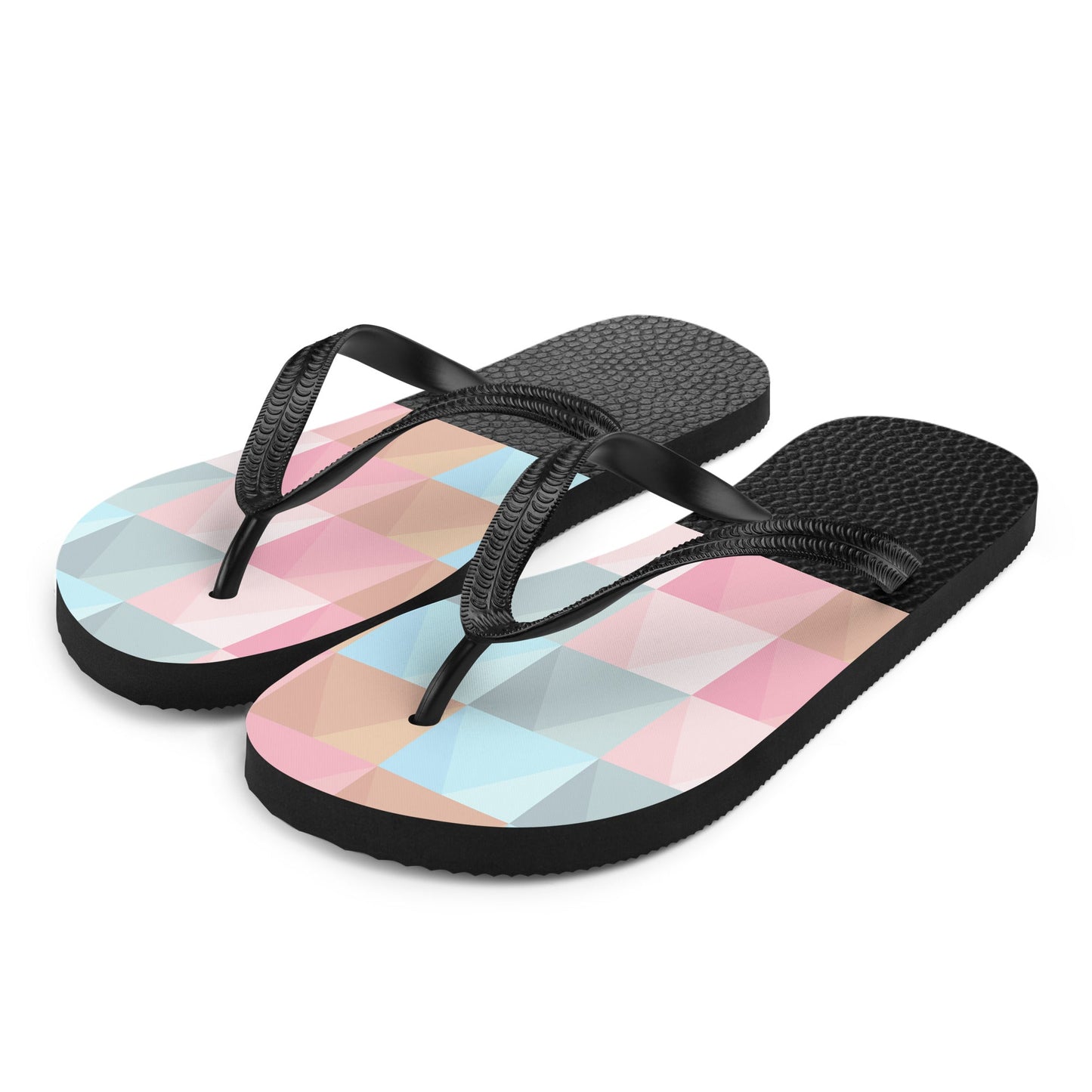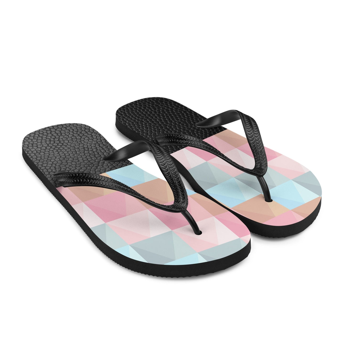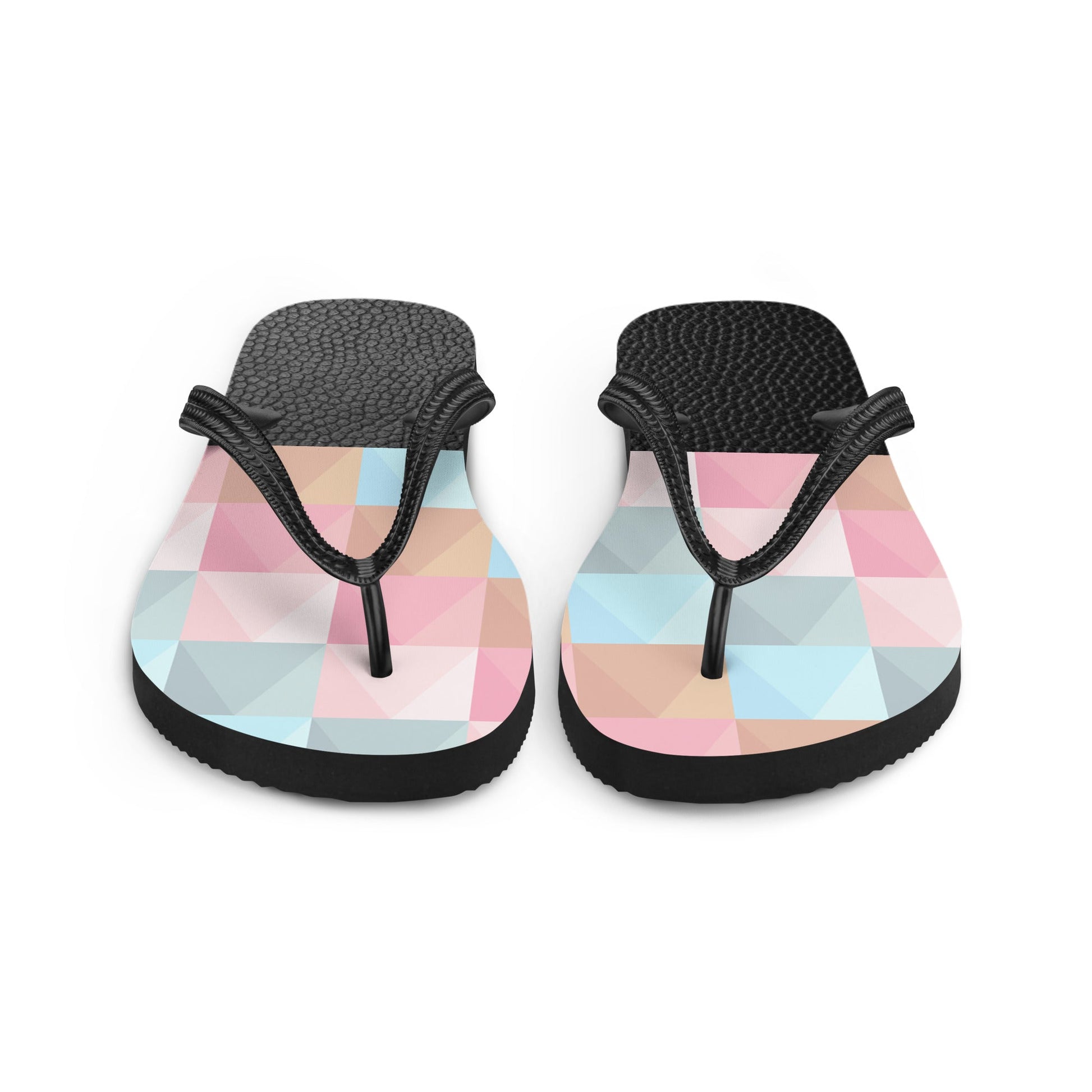 Go out in style and comfort with these flip-flops with a leather-like design and colorful shapes.