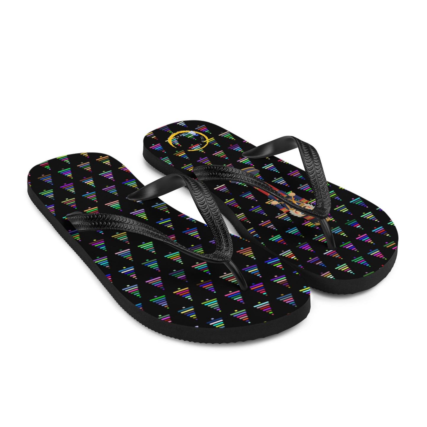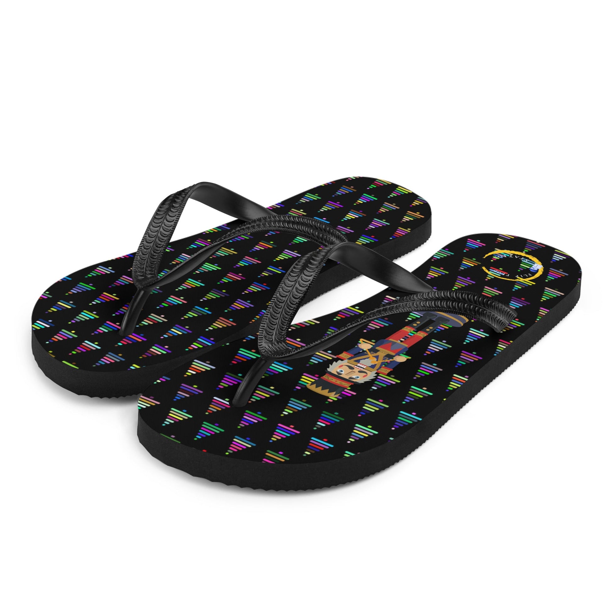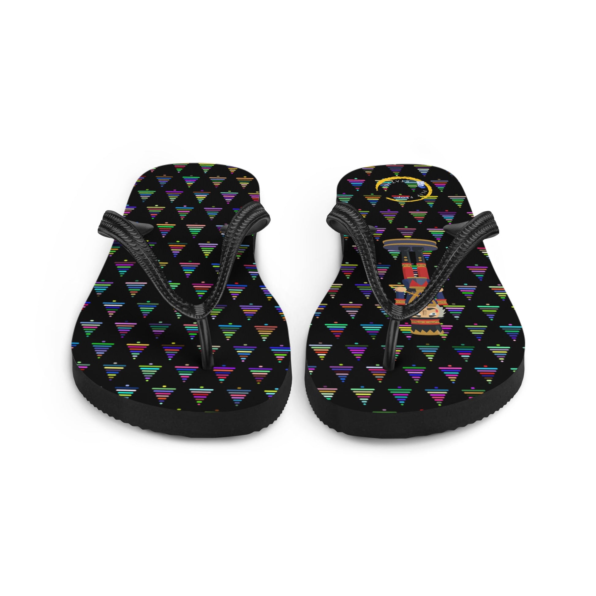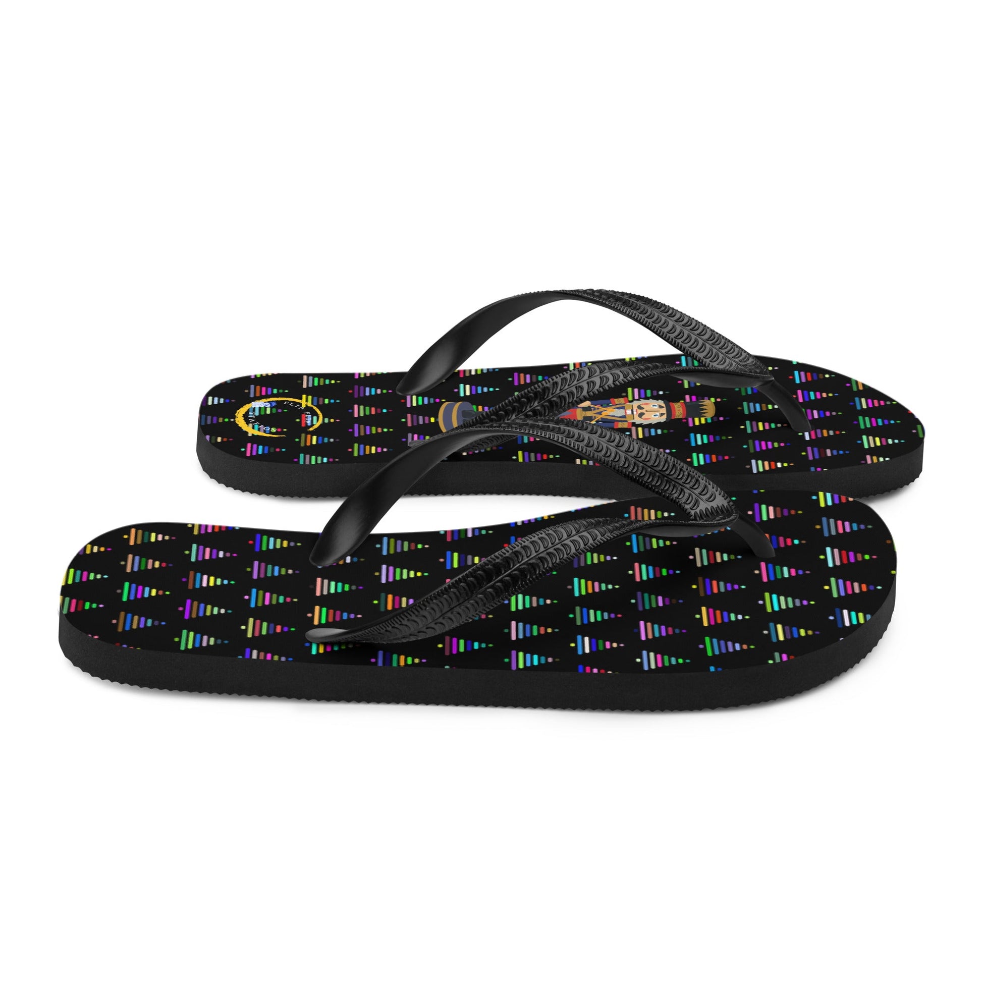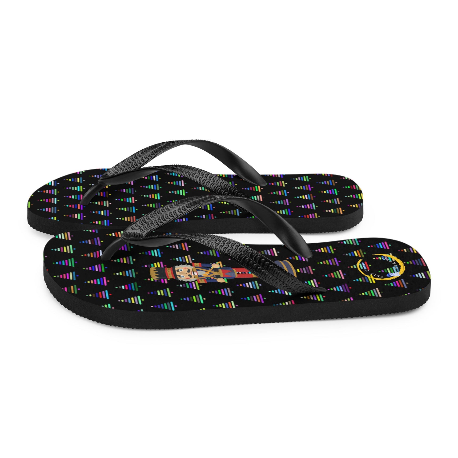 Step into holiday magic with these charming flip flops featuring a dark pine forest backdrop. A whimsical nutcracker figure adds a touch of festive cheer to your every step. Embrace the season in style and comfort!