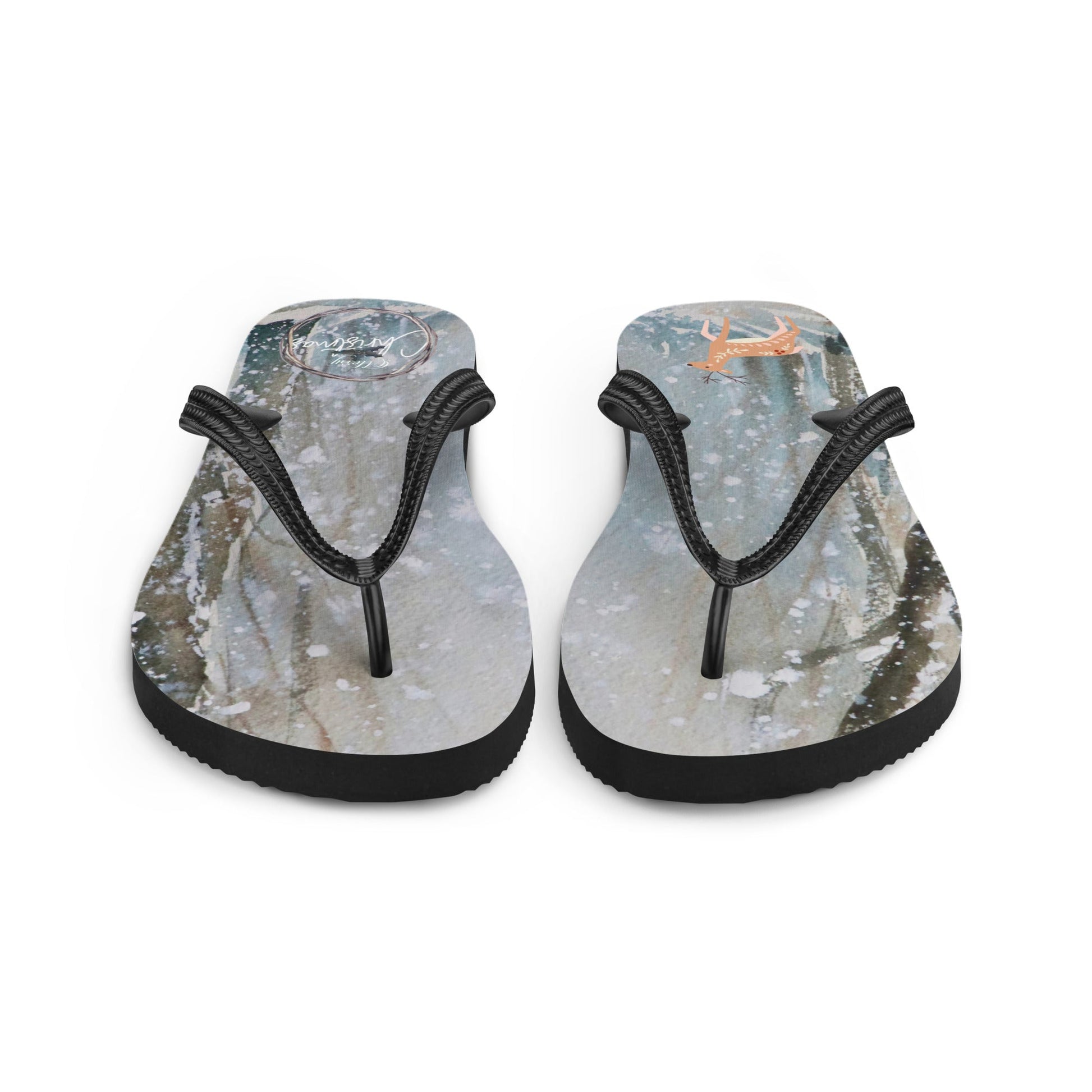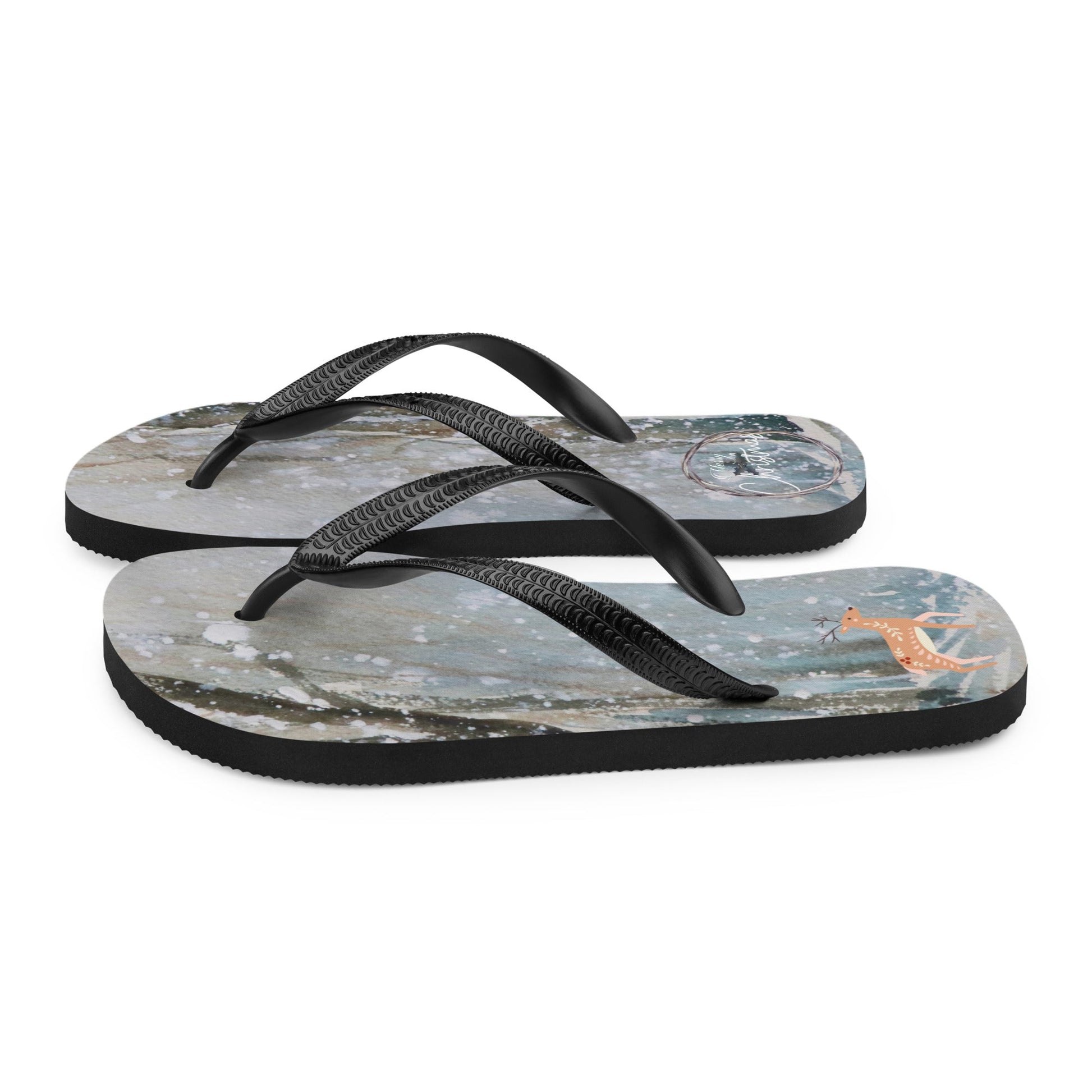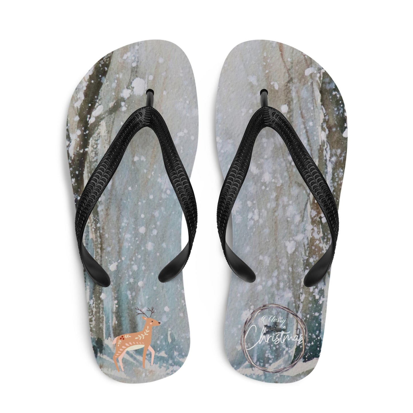 Step into the holiday spirit with our enchanting "Christmas Forest" flip flops. These festive footwear essentials are designed to bring a touch of winter wonderland to your every step.