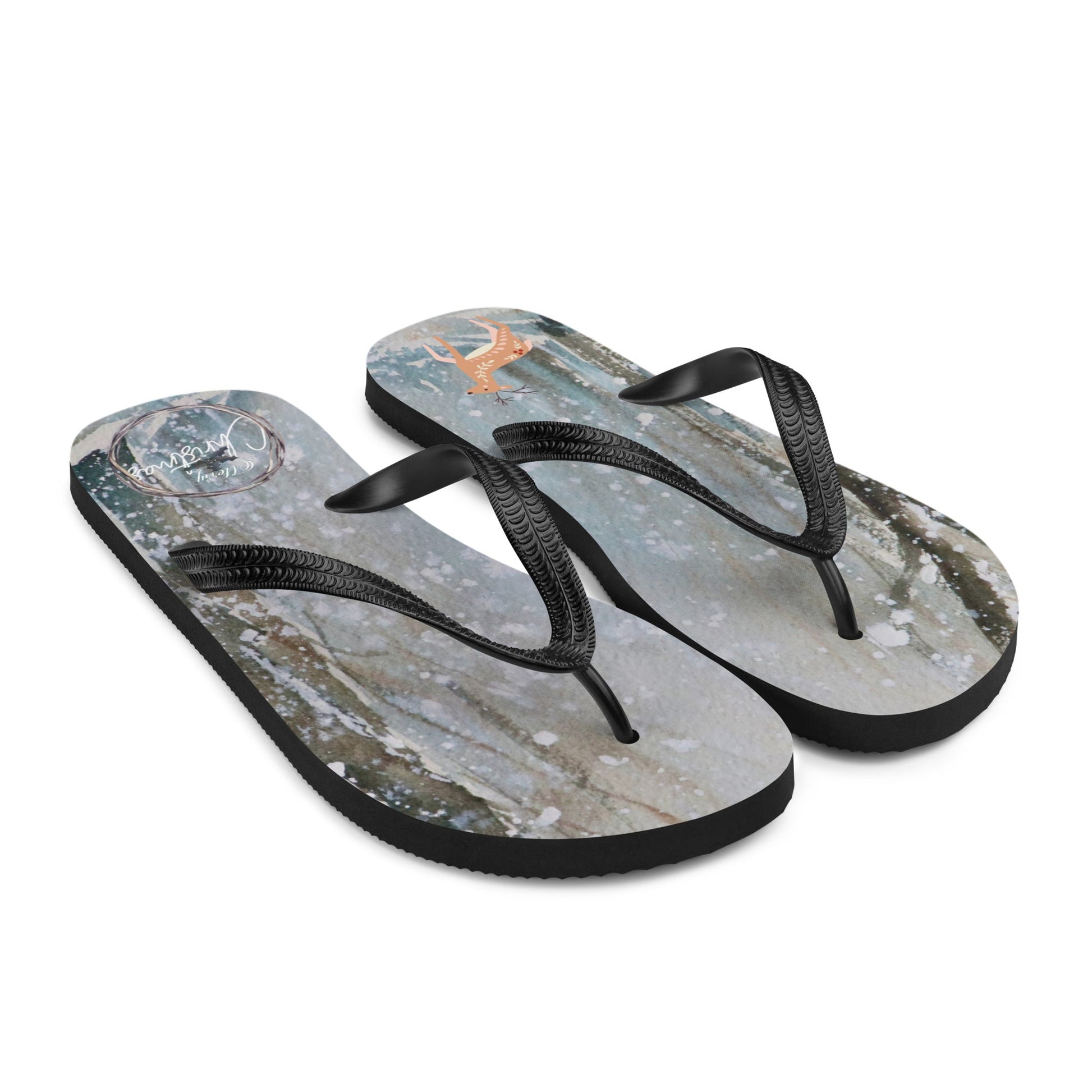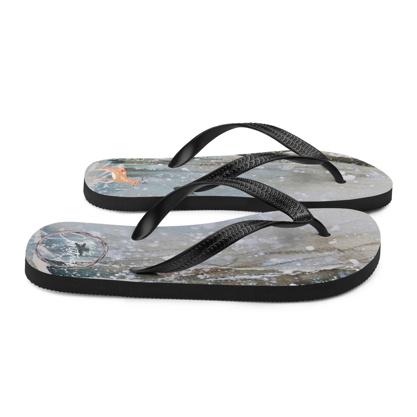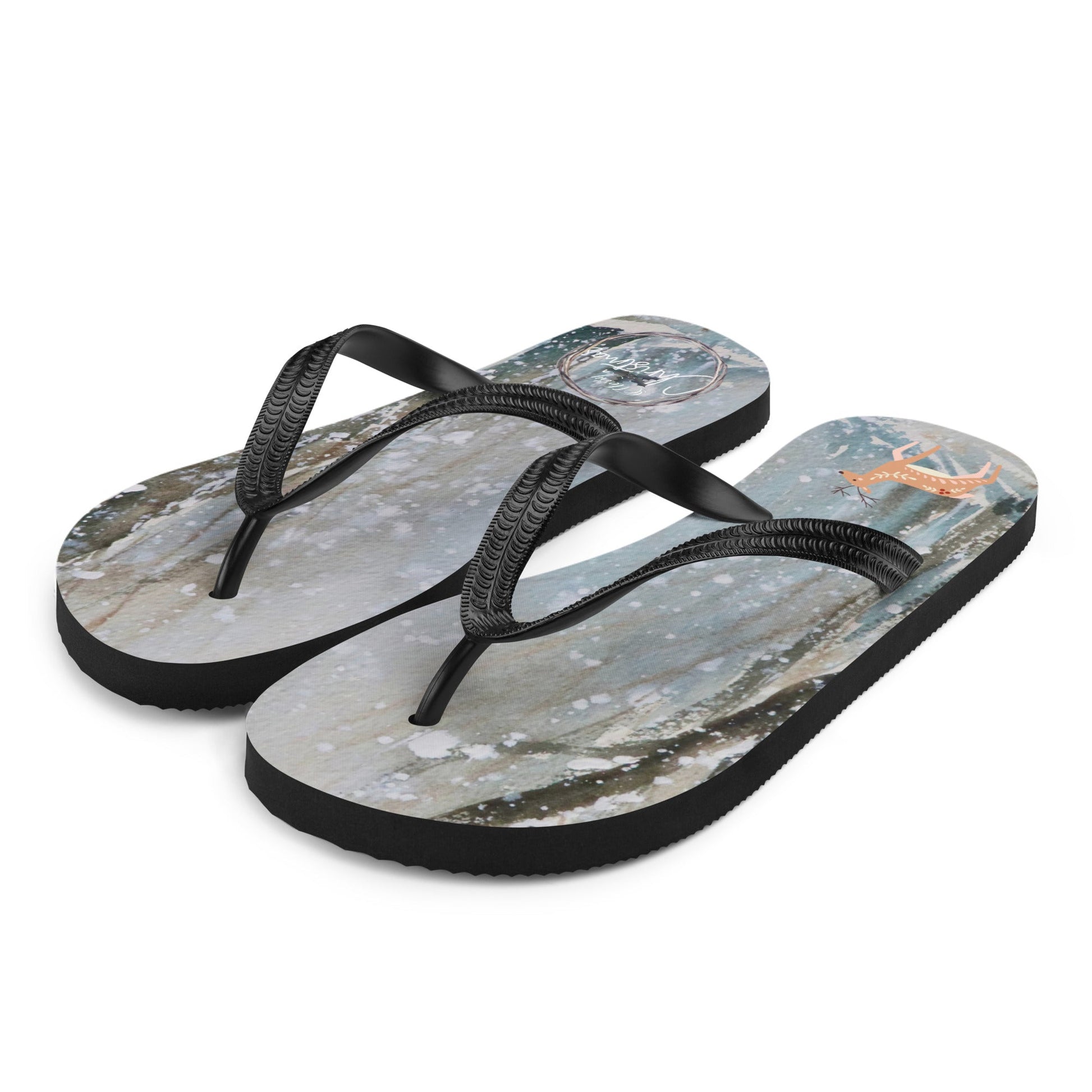 Step into the holiday spirit with our enchanting "Christmas Forest" flip flops. These festive footwear essentials are designed to bring a touch of winter wonderland to your every step.